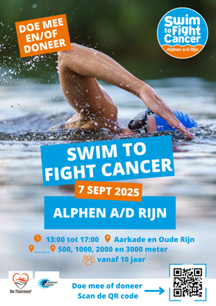 Na het grote succes van 2024 wordt Swim to Fight Cancer op zondag 7 september 2025 opnieuw georganiseerd in Alphen aan den Rijn! Ruim 200 deelnemers doken vorig jaar het water in en haalden samen een indrukwekkend bedrag op voor baanbrekend kanker onderzoek. Dit jaar willen we dat succes overtreffen en jij kunt erbij zijn!